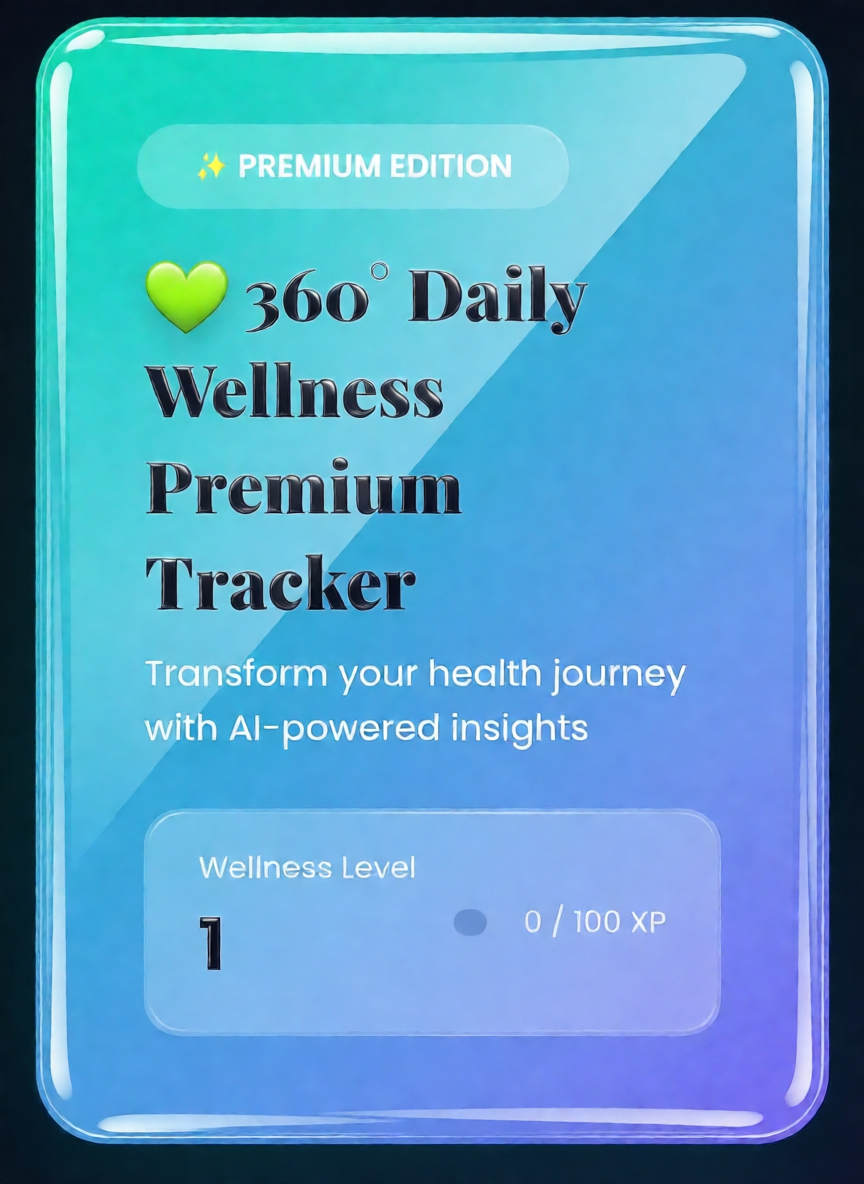 Your Complete Wellness Solution in One Powerful App Tired of juggling multiple apps, subscriptions, and internet-dependent tools? The 360ยฐ Daily Wellness Premium Tracker gives you EVERYTHING you need for total wellness transformationโall in ONE offline HTML file. ๐ WHAT MAKES THIS DIFFERENT? โ Works 100% Offline โ No internet required (except for optional music features) โ No Subscription โ Pay once, own forever โ All-in-One Solution โ Tracking + Music + AI insights in one app โ Privacy First โ Your data stays on YOUR device โ Lifetime Access โ Free updates included